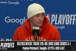 24直播网4月27日讯 NBA季后赛首轮G4,凯尔特人客场128-96大胜76人,总比分3-1拿到赛点。赛后普里查德接受了媒体采访,以下为采访全文。
