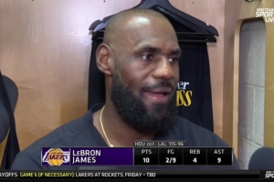 24直播网4月27日讯 NBA季后赛首轮G4,湖人91-113不敌火箭,系列赛大比分来到3-1。赛后詹姆斯接受了采访,以下为完整采访内容。