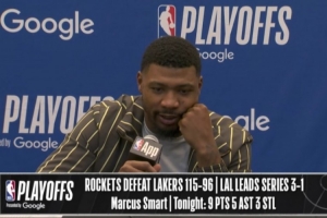 jrs直播网4月27日讯 在今天结束的一场季后赛中,湖人以96-115不敌火箭,大比分3-1领先。赛后,湖人球员马库斯·斯玛特出席了新闻发布会。以下是完整版采访内容。