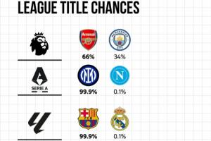 上一篇: 悬念只看英超!五大联赛夺冠概率:阿森纳66%,巴萨国米巴黎99.9%