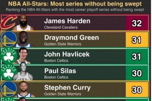 下一篇: 从未被横扫过的球员谁打的系列赛最多?哈登32轮第1 追梦2库里4