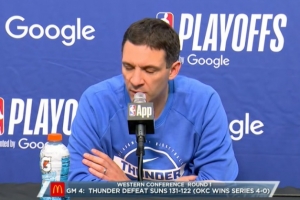 jrs直播网4月28日讯 NBA季后赛首轮G4,雷霆131-122胜太阳,大比分4-0晋级。赛后雷霆主帅戴格诺特接受了媒体采访,以下为完整版采访内容。