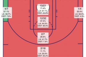 本场比赛火箭89投36中,命中率40.4%,美媒晒出本场投篮热图,除了左侧底角三分7中4之外,其余都低于联盟平均水平,两侧底角之外三分更是离谱的18中2。