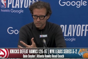 jrs直播网4月29日讯 NBA季后赛,尼克斯126-97大胜老鹰,总比分3-2领先。斯奈德赛后接受了媒体采访,以下为采访全文。