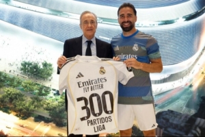赛后,皇马主席弗洛伦蒂诺向卡瓦哈尔赠送了300场纪念球衣。