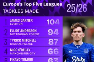 jrs直播网04月23日讯 数据机构squakwa统计了本赛季至今五大联赛英格兰球员铲球次数榜,加纳居首,安德森位列次席,曼城的奥赖利和阿森纳赖斯在列,米兰的托莫里和里昂的奈尔斯是本榜单中非英超联赛的球员。