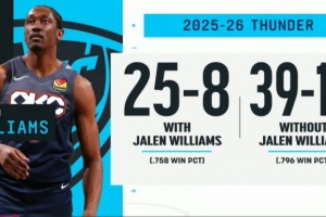 下一篇: 缺席后胜率更高?本赛季杰伦威在场雷霆25胜8负 缺席期间39胜10负