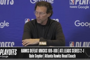 24直播网4月24日讯 NBA季后赛东部首轮G3,老鹰109-108险胜尼克斯,大比分2-1领先,赛后斯奈德接受了媒体采访,以下为采访全文。