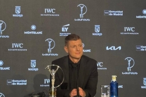 24直播网4月21日讯 2026年劳伦斯体育颁奖典礼本周一举行,德国/皇马名宿克罗斯获得最佳体育励志奖,德约科维奇为其颁奖,克罗斯随后接受了采访。