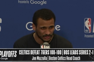 24直播网4月25日讯 NBA季后赛首轮G3,凯尔特人108-100战胜76人,大比分2-1领先,赛后马祖拉接受了媒体采访,以下为采访全文。