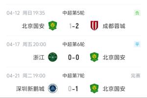 24直播网04月21日讯 中超第7轮,北京国安客场1-0绝杀深圳新鹏城。此役过后国安终结了球队连续5轮中超的不胜战绩。国安中超首轮客场2-0击败武汉三镇后,随后对阵泰山、申花、铁人、蓉城、浙江连续5轮未尝胜绩。