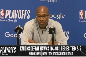 24直播网4月26日讯 NBA季后赛首轮G4,尼克斯114-98轻取老鹰,大比分战成2-2平。赛后迈克·布朗接受了媒体采访,以下为采访全文。