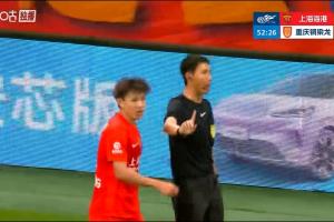 24直播网04月21日讯 中超第7轮,上海海港vs重庆铜梁龙。比赛第53分钟,王燊超边路带球对抗后倒地,裁判判罚铜梁龙的门球。王燊超对此十分不满,起身一瘸一拐地朝边裁抗议,主裁张雷过来向他出示黄牌。