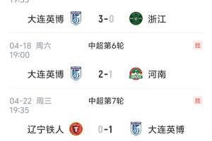 大连英博近5轮中超战绩: